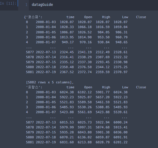이런식으로 쓰면 온전한 데이터를 얻을 수 있습니다.( 딕셔너리 안에 데이터 프레임이 저장된 형태)