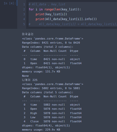이렇게 한 파일 경로 위치에 있는 모든 csv파일들을 불러온 후에 All_data라는 딕셔너리 내부에 파일명을 이름으로 하여 딕셔너리를 만든다. 한마디로 딕셔너리 내부에 데이터들을 저장하였다.