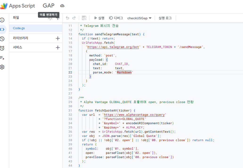 위 코드를 입력하고, checkUSGapWithFinnhub 테스트, setUpTriggers실행하시면 됩니다!.
